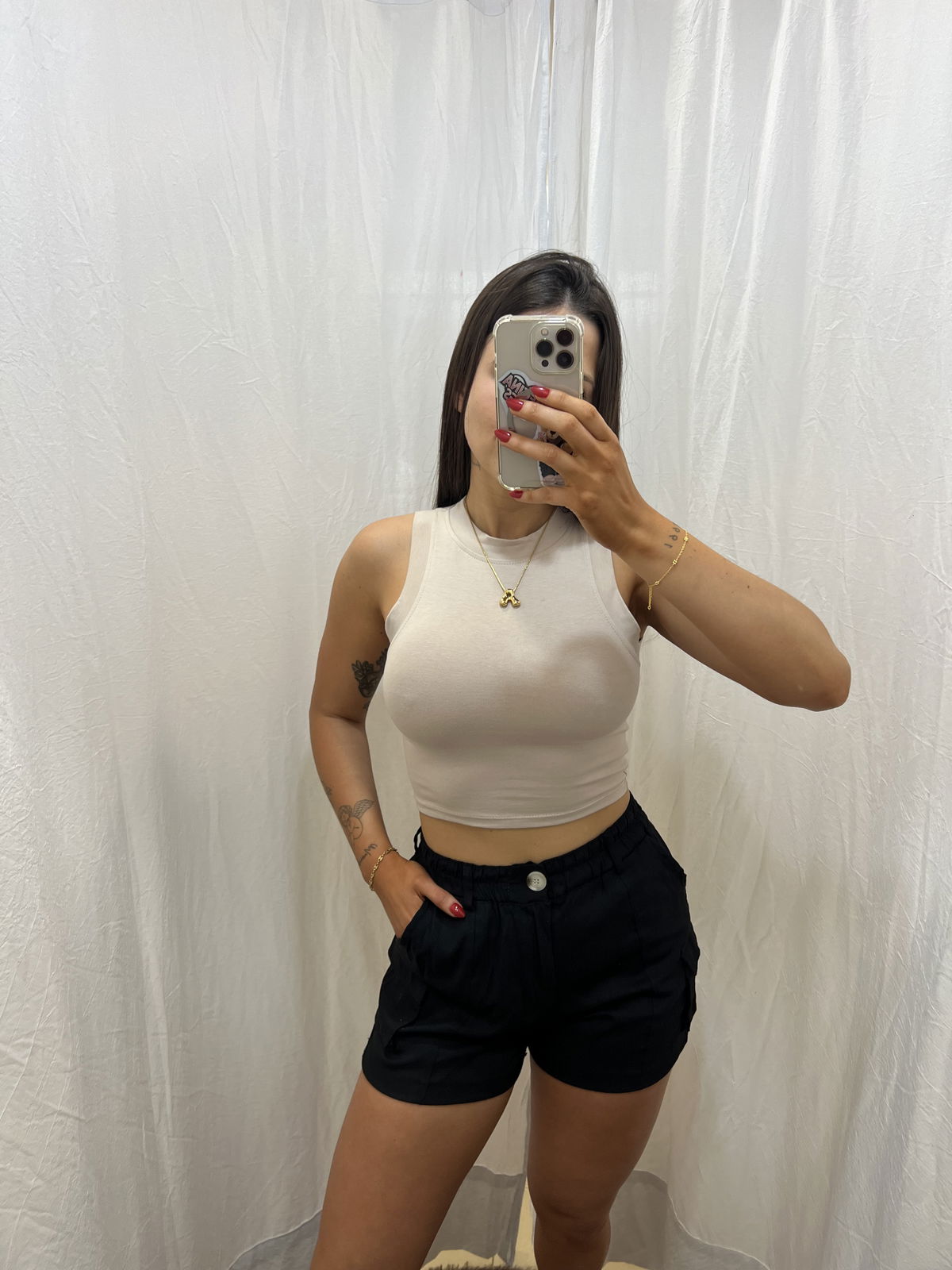 La chica de la foto está usando talle L y es un talle 38/40 de pantalón