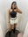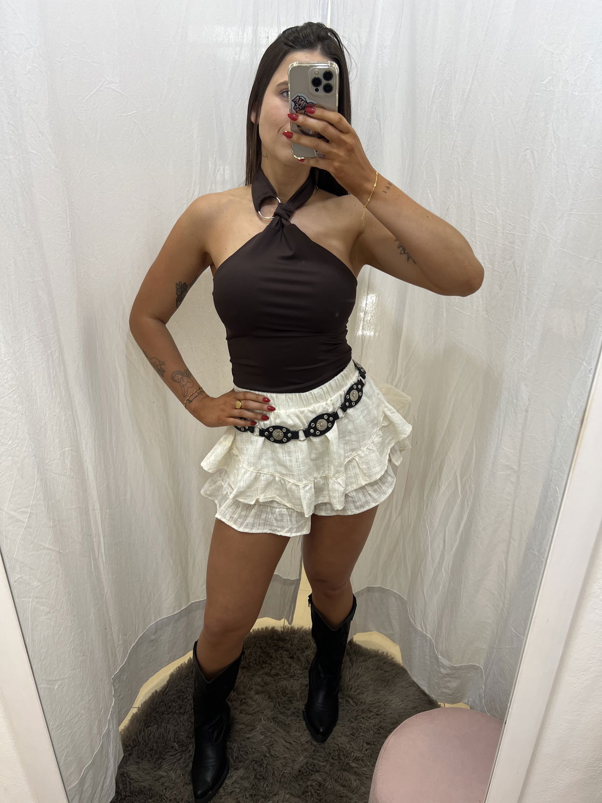 La chica de la foto mide 1.68 cm, tiene talle 90 de busto y 38/40 de pantalón y está usando talle M.