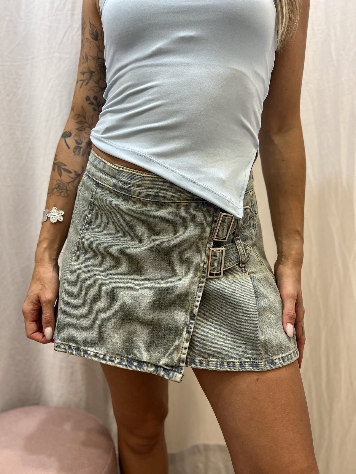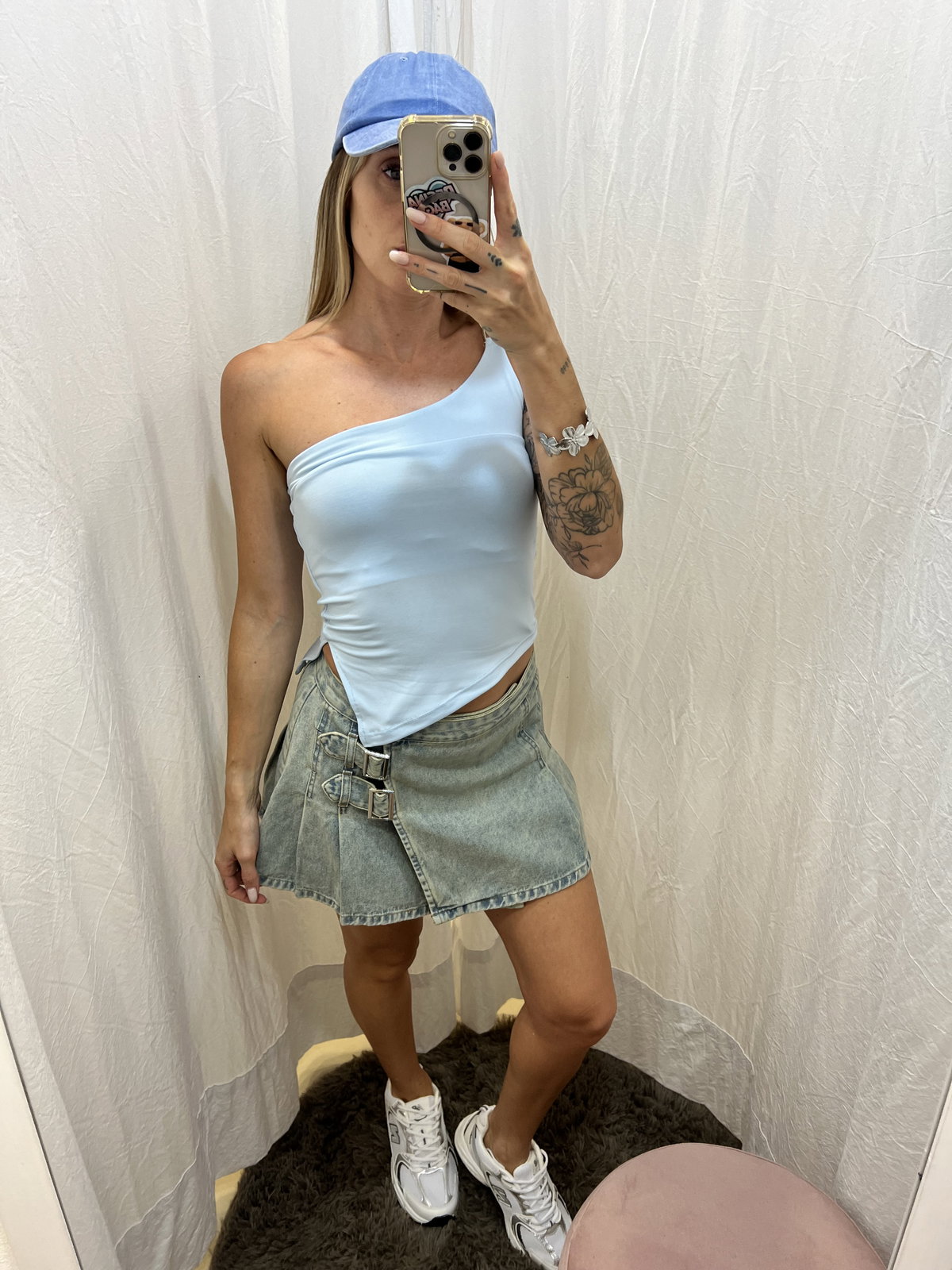 la chica rubia es 36/38 y está usando talle 36.