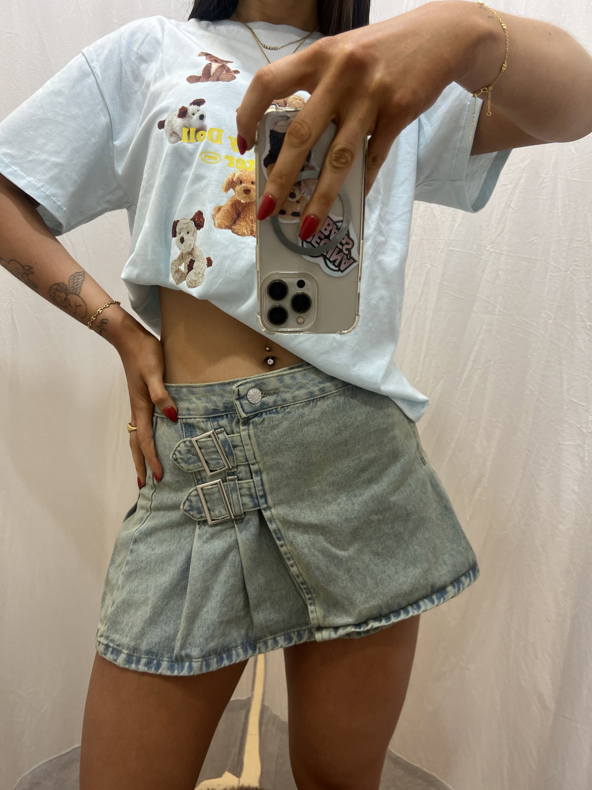 La chica de la foto mide 1.68, es talle 38/40 y está usando talle 38 de este modelo.