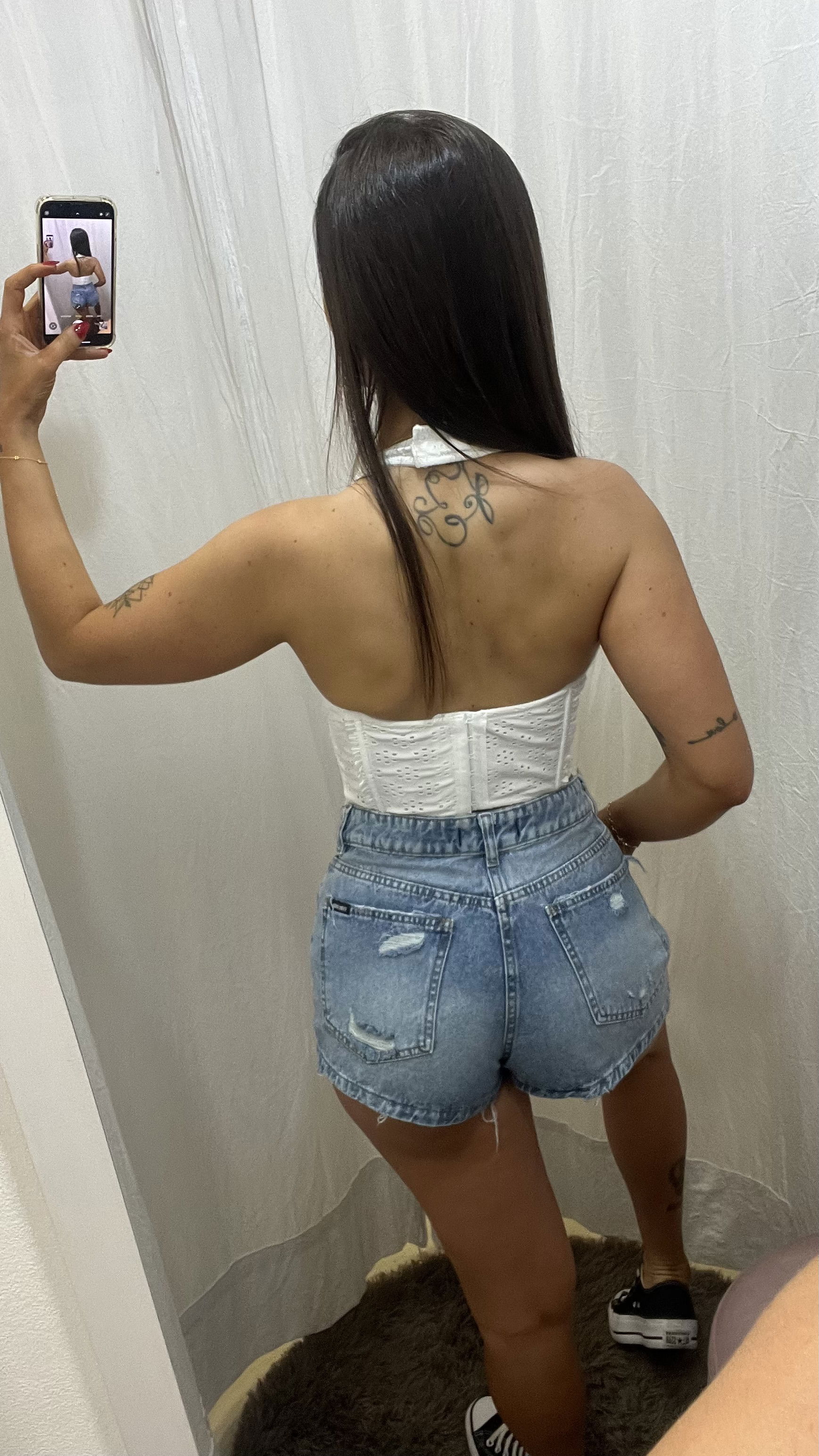 La chica de la foto mide 1.68, es talle 38/40 y está usando talle 38 de este modelo.