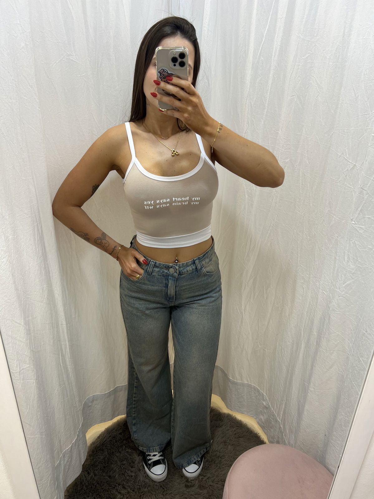 Elegir tu talle habitual. La chica de la foto mide 1.68 y es talle 38/40. Está usando talle 38 en la foto.